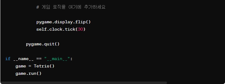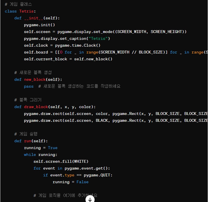 Python을 사용한 간단한 테트리스 게임의 예시를 제공하겠습니다. 이 코드는 Python의 Pygame 라이브러리를 사용하여 작성되었습니다. Pygame은 게임을 개발하기 위한 매우 유용한 도구입니다. 이 코드는 아직 완전하지 않으며, 테트리스 블록을 무작위로 생성하고 그리는 데 필요한 로직이 빠져 있습니다. 하지만 이것은 시작점이 될 수 있습니다. 필요한 로직을 추가하여 완전한 테트리스 게임을 만들어보세요!