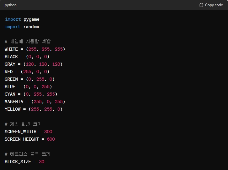 Python을 사용한 간단한 테트리스 게임의 예시를 제공하겠습니다. 이 코드는 Python의 Pygame 라이브러리를 사용하여 작성되었습니다. Pygame은 게임을 개발하기 위한 매우 유용한 도구입니다. 이 코드는 아직 완전하지 않으며, 테트리스 블록을 무작위로 생성하고 그리는 데 필요한 로직이 빠져 있습니다. 하지만 이것은 시작점이 될 수 있습니다. 필요한 로직을 추가하여 완전한 테트리스 게임을 만들어보세요!